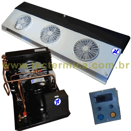 - Composição do kit: condensadora com visor de liquido, pressostato, filtro secador e tanque de liquido; unidade evaporadora com válvula de expansão, válvula solenoide, revestimento antigotejamento e antisudação; painel de controle com caixa de acondicionamento, controlador digital, interruptores on/off e fusíveis de proteção